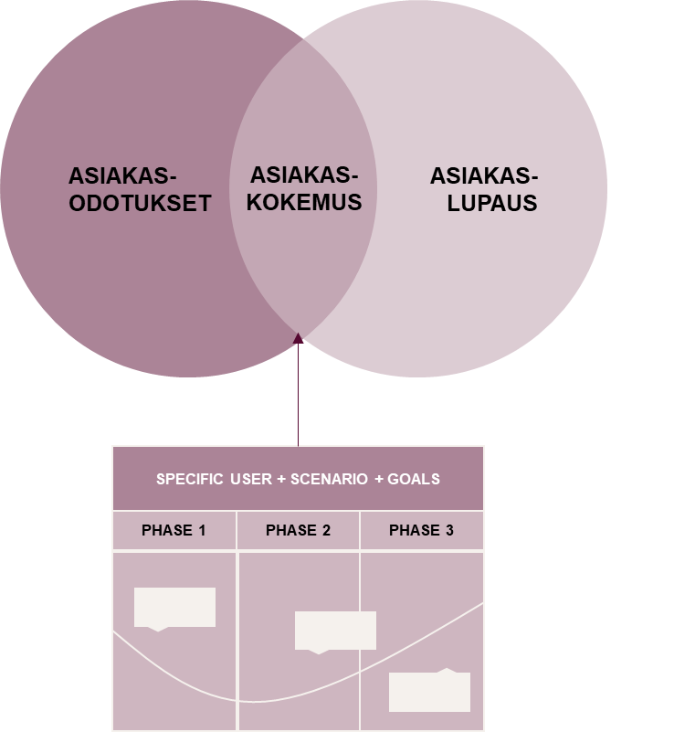 Asiakaskokemus rakentuu asiakkaan kohtaamisista asiakaspolulla. Sen varrella asiakasodotukset rakentuvat ja asiakaslupaus lunastetaan – tai jää lunastamatta. Asiakaskokemus on asiakasodotusten ja asiakaskohtaamisten erotus.